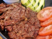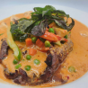Premium USDA Rib eye steak with mushroom, bell pepper, peas, and carrot in red panang curry.
