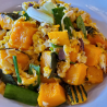 Pumpkin, bell pepper, and basil with red curry in coconut milk.