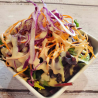 Grilled chicken breast with teriyaki sauce, sesame seeds, steamed broccoli, cabbage, and carrot. Served with steamed rice.