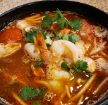 Authentic hot & sour soup with combination of seafoods with basil, mushroom, lemon grass, ginger, galangal, kaffir lime leaves and scallion.