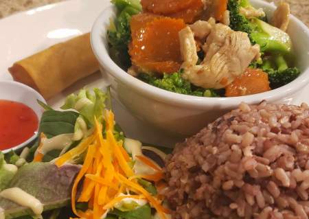 Thai's favorite spicy dish with chilli, bell pepper, green beans, and basil leaves.
