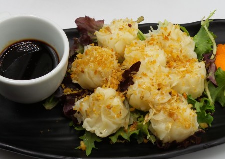 Steamed shrimp dumpling with sesame oil topped with fried garlic with sweet black sauce..
