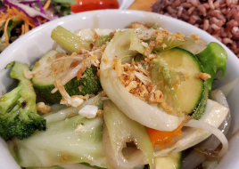 The most popular Thai'f100dle.stir-fried in house sauce, egg green onion, and bean sprouts with crushed peanut.